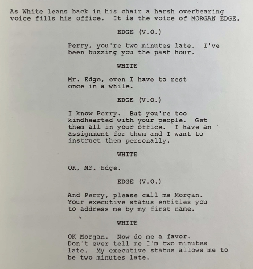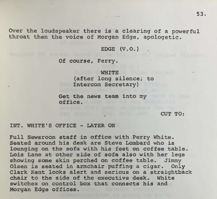 Another change that occurs in the script is that Edge’s lines to Lois about reading the wrong weather report are now given over to Perry White in this draft. Furthermore, we are now treated to a warmer, more casual side of Morgan Edge, as he regards Perry White with respect as a senior executive of the Galaxy Communications team, even through his gruffness.