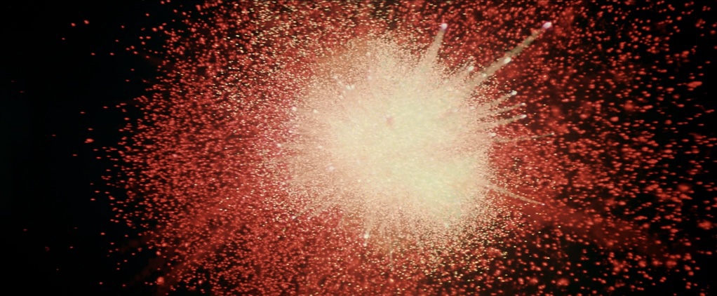 The bomb explodes, ripping a hole in outer space and hurtling Superman back to Earth.